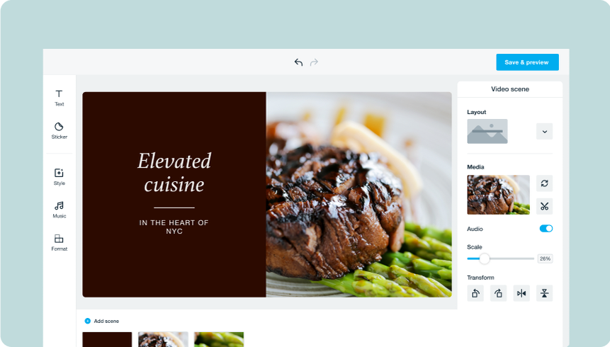 Spend time prepping your plates for the spotlight to make them camera-ready before you start shooting. Experiment with angles and different types of shots. When it comes to putting your food on display for food catering ads or restaurant food videos, close-up shots are best. Be sure to focus your camera as you zoom in, and try to get shots of your food from a bird’s-eye view and from the side at an angle. Get several shots of each plate you want to include; add your favorites later with Vimeo Create’s free restaurant video editor.