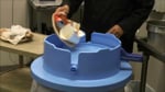 Tim Hunkin commandeers a fork lift to flatten out large metal dishes from a thrift store.